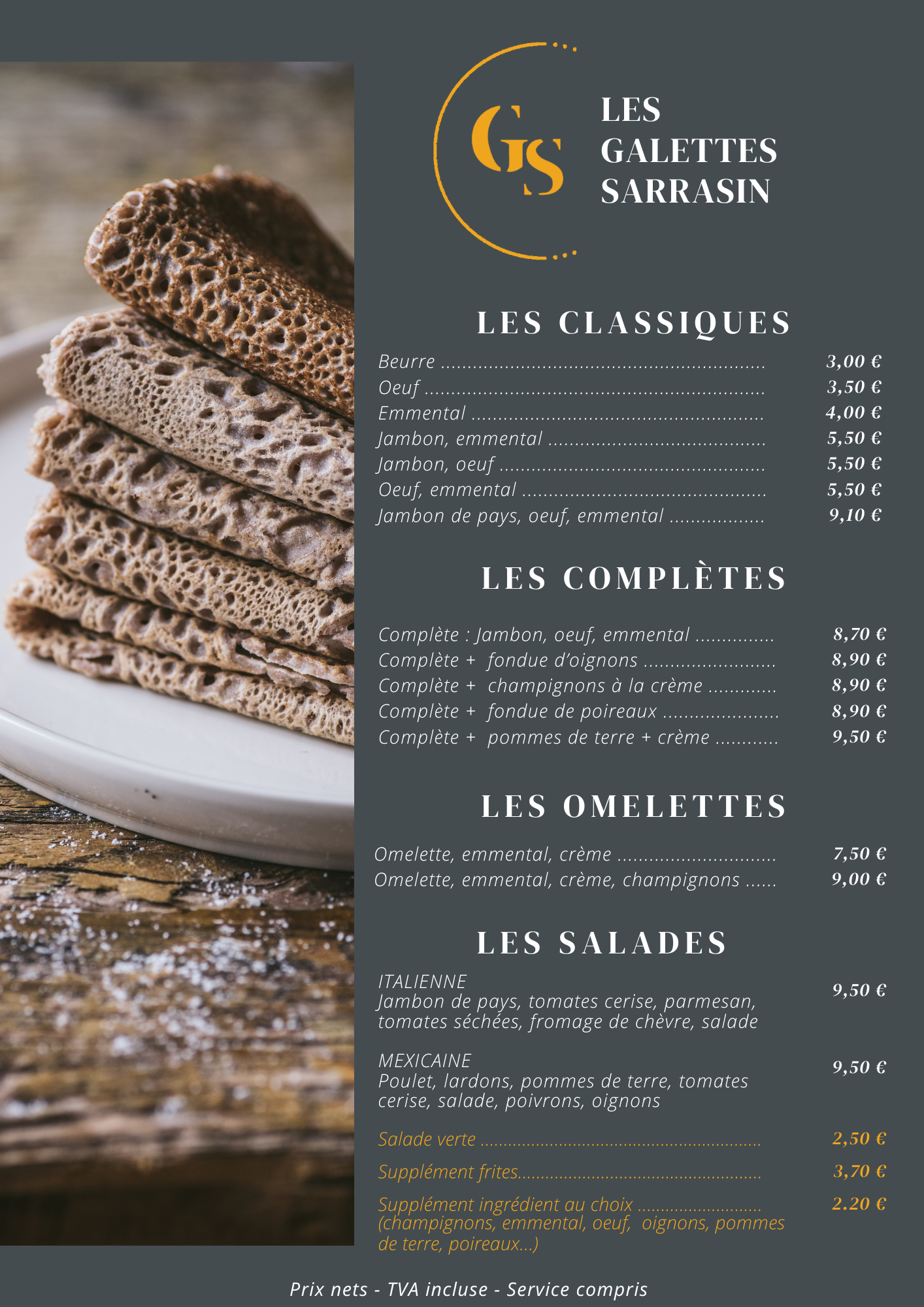 – les spécialités gourmandes : Karamelo, Délice de pommes, Antillaise, Flambée,gourmande …creme fouettée maison !
